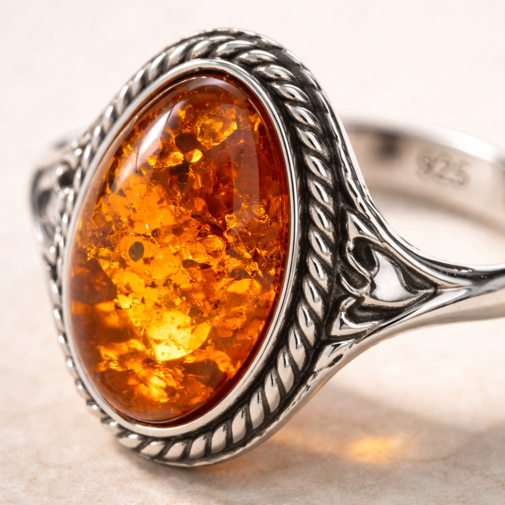 Many popular amber ring styles are set in sterling silver 925, which pairs especially well with the warm tones of amber. Silver gives the ring a clean, polished finish and makes it versatile enough for everyday wear or dressier occasions.