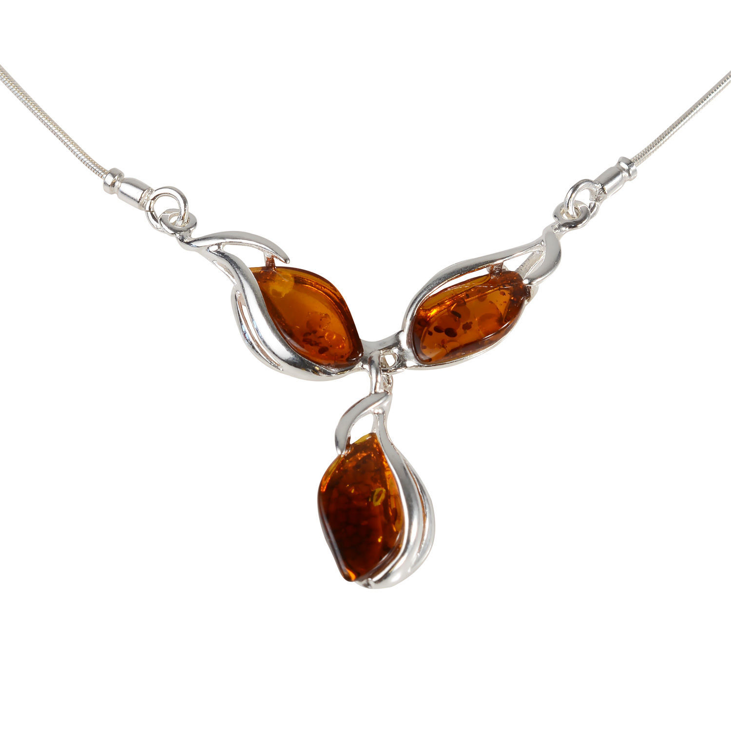 This 17" sterling silver necklace has 3 polished honey amber stones. This sterling silver necklace has matching earrings "Elsie". This is a beautifulĀ honey amber necklace and a great gift to give! Since amber is a natural stone, its shape and size may vary slightly. Handcrafted in Europe.