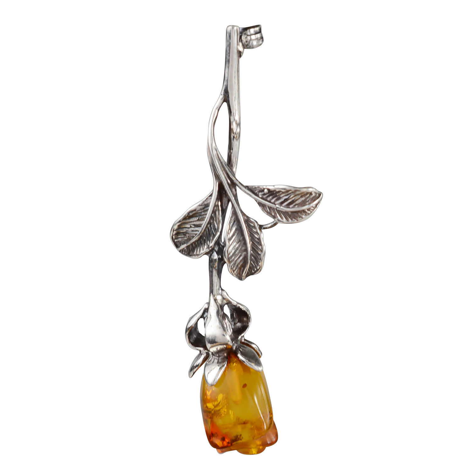 This 2 inch long genuine Baltic amber and sterling silver brooch "Rose" feature a carved honey flower measuring approximately 0.53". Such a sterling silver brooch is a classic piece to wear on a jacket or a scarf and is sure to catch everyone's eye.