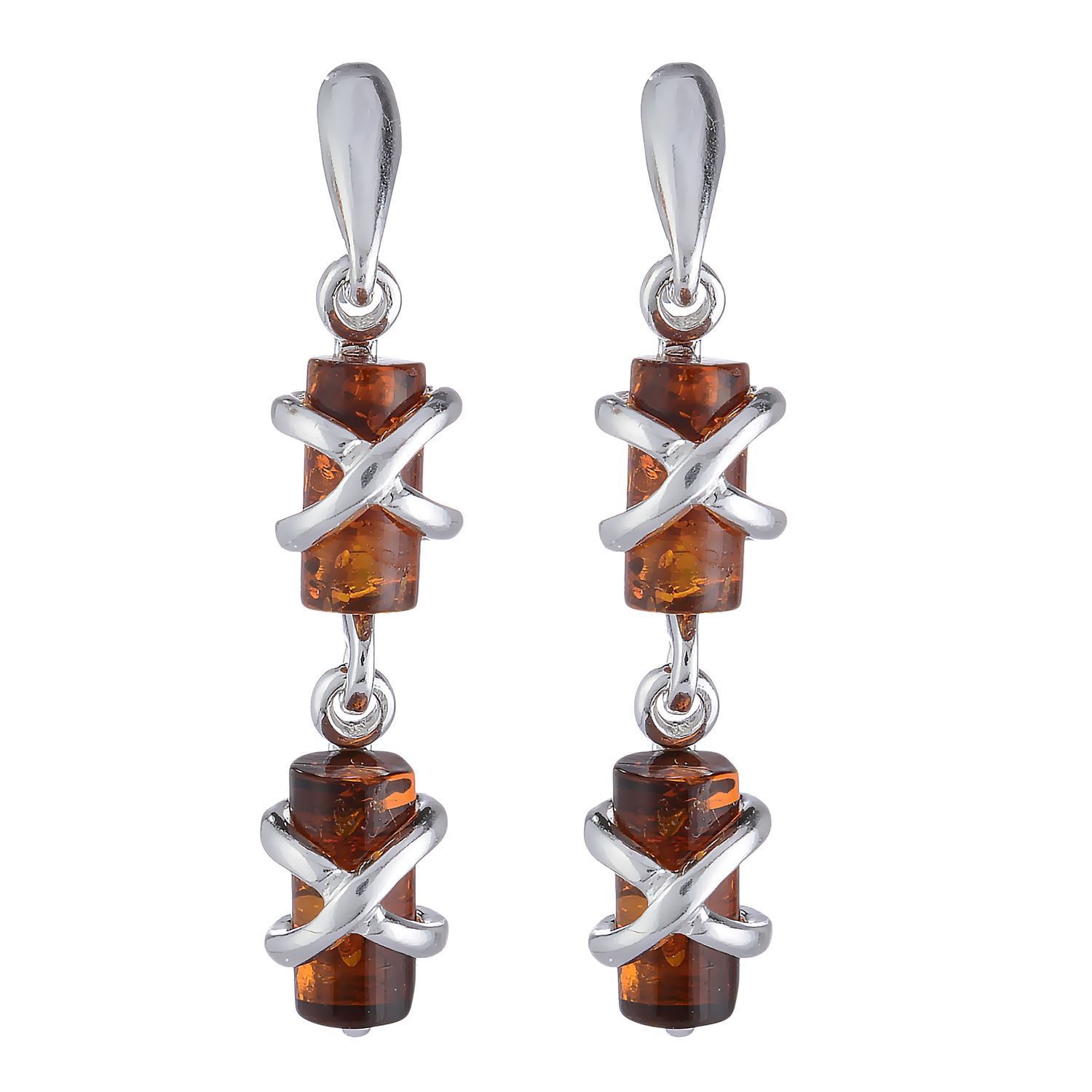 These beautiful earrings are handmade in Poland by skilled artisans, and feature two genuine Baltic amber stones in a stunning criss-crossed silver setting. The dark cognac tube-shaped amber stones are 0.4"x0.2" in size, and the earrings have a total length of 1.4". They're a perfect accessory for any outfit, whether you're dressing up for a special occasion or just everyday wear.