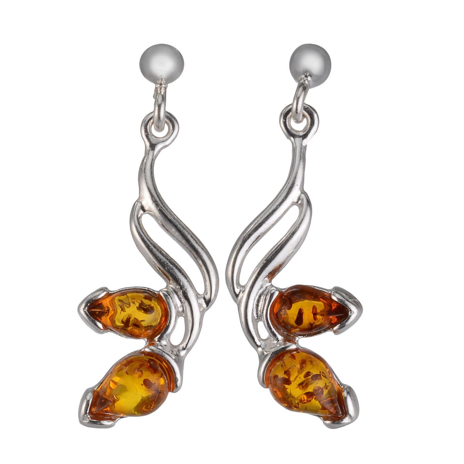 These lovely earrings are handmade in Poland with genuine Baltic amber and 925 sterling silver. The earrings feature two pear shaped amber cabochons sized 0.3"x0.19" and 0.2"x0.16" on each earring, for a total of 4 cabochons. The earrings have a total length of 1.2", width of 0.6", and weigh 3.75 g. They're lightweight and have a post back closure, making them very comfortable to wear.