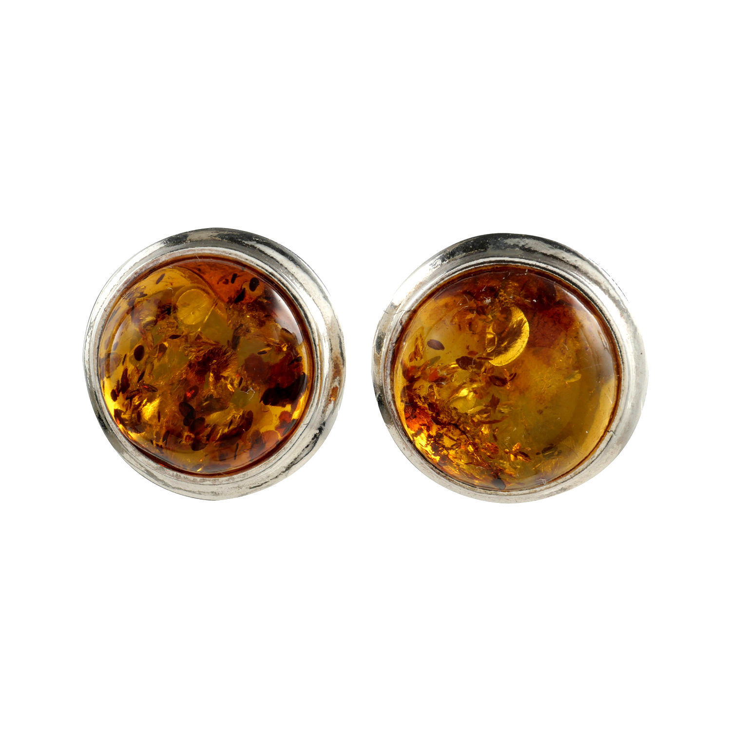 TheseĀ stunning studĀ earrings are handmade in Poland by skilled artisans and feature genuine Baltic amber.Ā Ā The round translucent honey amber cabochon measures 0.4" and is set in 925 Sterling Silver. The earrings have a total length of 0.55" and weigh 2.70 g. They fasten securely with post back closures and are very comfortable to wear.Ā The sterling silver and Baltic honey amber create a beautiful and unique look that you will love to wear.Ā