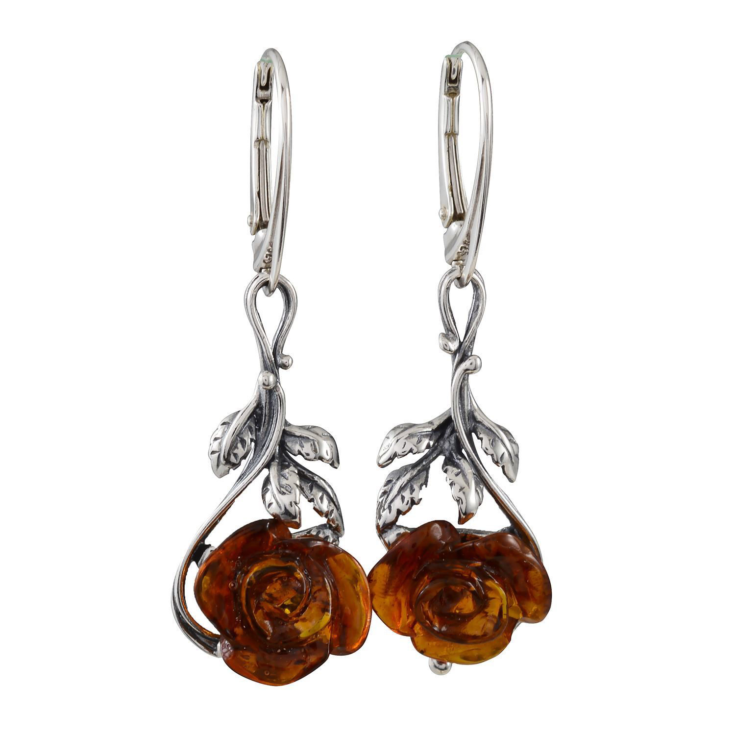 • Sculpted genuine amber roses rest at the end of each earring, offering a sculptural look for a classic natural stone choice.