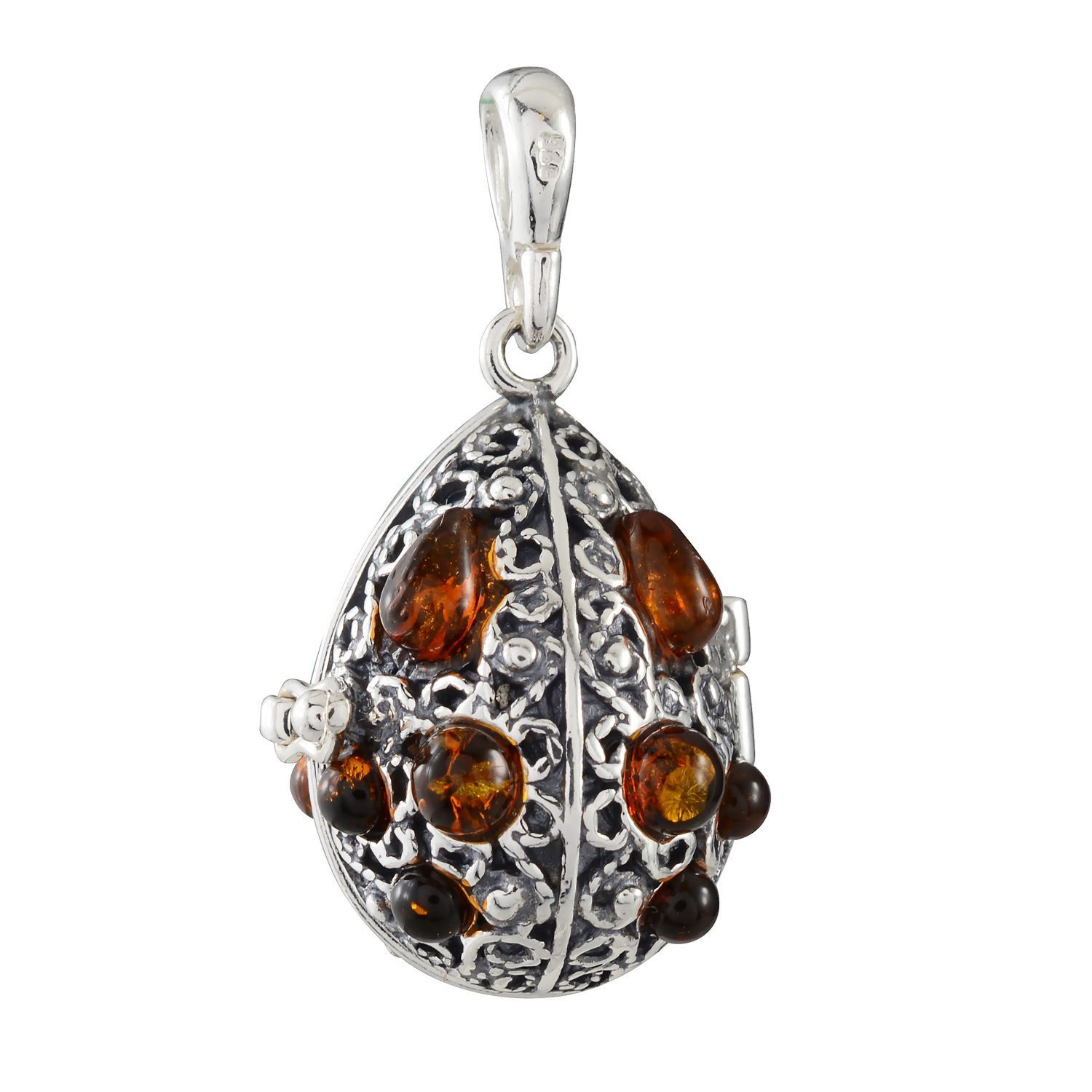 This beautiful and vibrant sterling silver Baltic honey amber locket pendant is adorned with 16 stones swings from an 18" sterling silver chain secured with a lobster clasp. It is believed that amber brings luck and protection to people and it has been a symbol of love, marriage, and eternal youth. Since amber is a natural stone, its shape and size may vary slightly. Each piece is individually handcrafted in Europe. A complimentary silver-plated necklace is included.