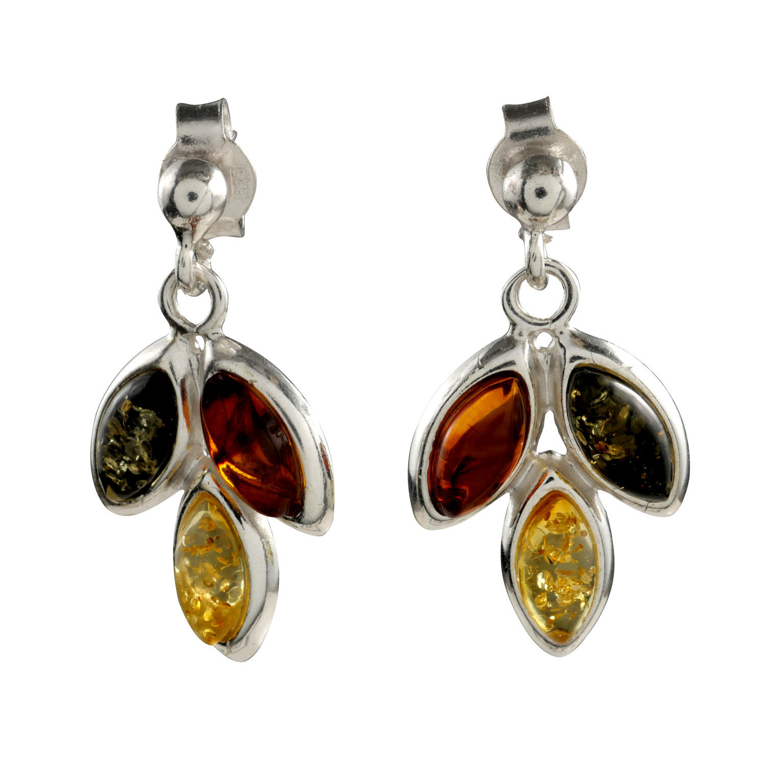 Introducing our stunning "Autumn" earrings, handmade with genuine Baltic amber and 925 sterling silver. These beautiful earrings feature three multicolored stones in shades of green, honey, and lemon, each measuring 0.31" x 0.15". The total length of the earrings is 1"; width is 0.55" and they have a post back closure to ensure worry-free wearing. The total weight of the earrings is 3.92 grams.