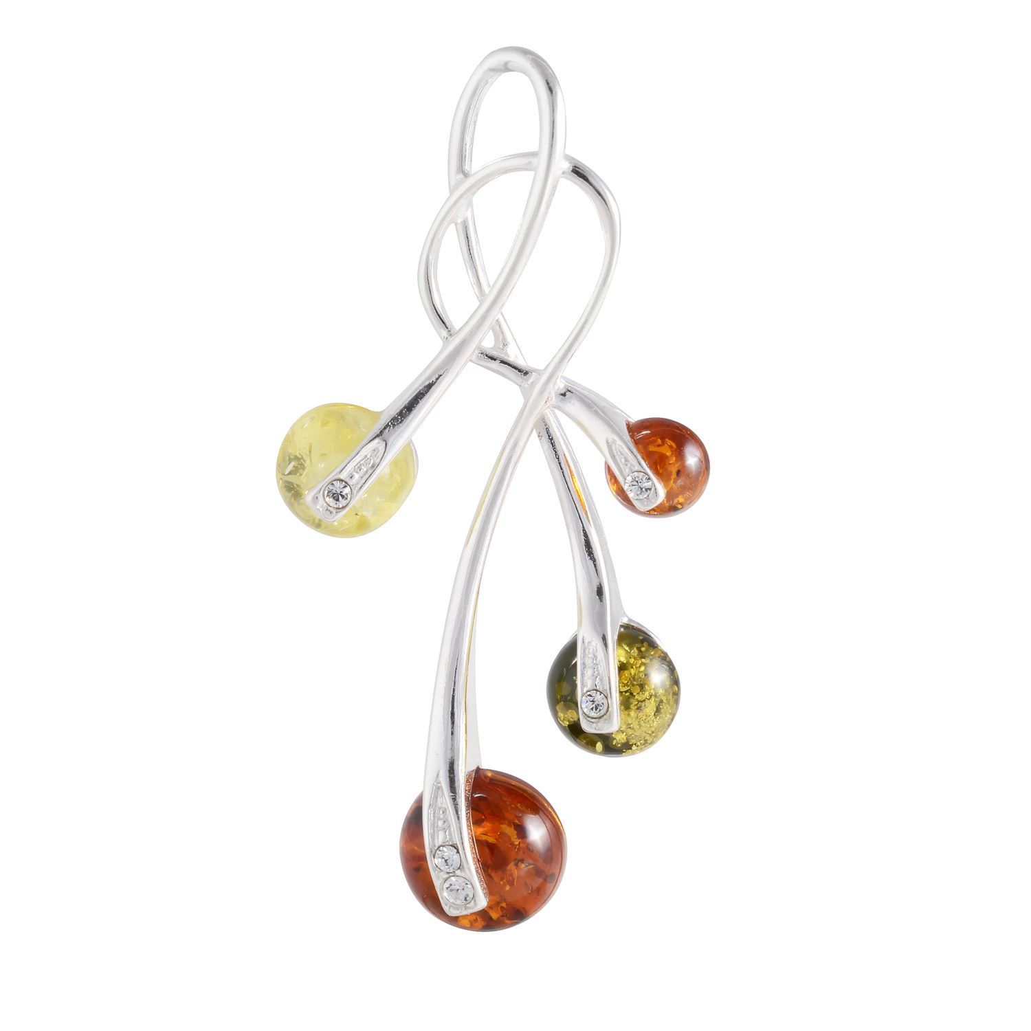 Add a pop of color to any outfit with this Sterling Silver and Baltic Multicolored Amber Pendant. The pendant is crafted from genuine Baltic amber, 925 sterling silver, and clear crystals, and features three different-sized stones in shades of yellow, green, and orange. Pendant's total height is 2", width is 0.95", and stone size is 0.4", 0.3", and 0.2".
