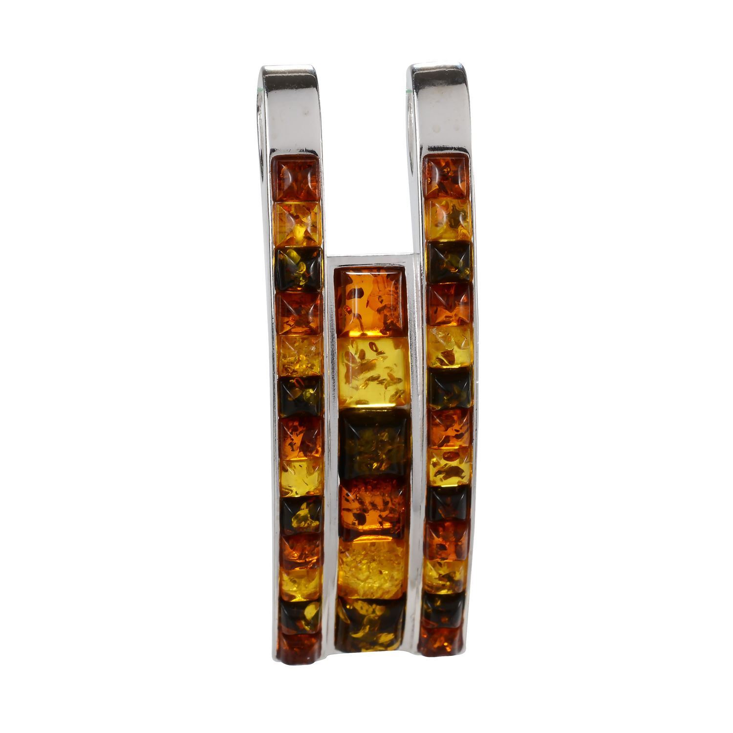 This dazzling sterling silver and Baltic multicolored amber Mila pendant is a beautiful addition to any woman's jewelry collection. The pendant is made of sterling silver and has a total height of 1.8 inches, with a width of 0.6 inches. It features three rows of square, multicolored ambers of different sizes.  There are a total of 6 amber stones sized 0.19" as well as smaller 26 amber stones measuring 0.12". The pendant weighs 7.57 grams and comes with an 18" sterling silver chain. This Baltic amber pendant can be worn with Melania earrings (sold separately).